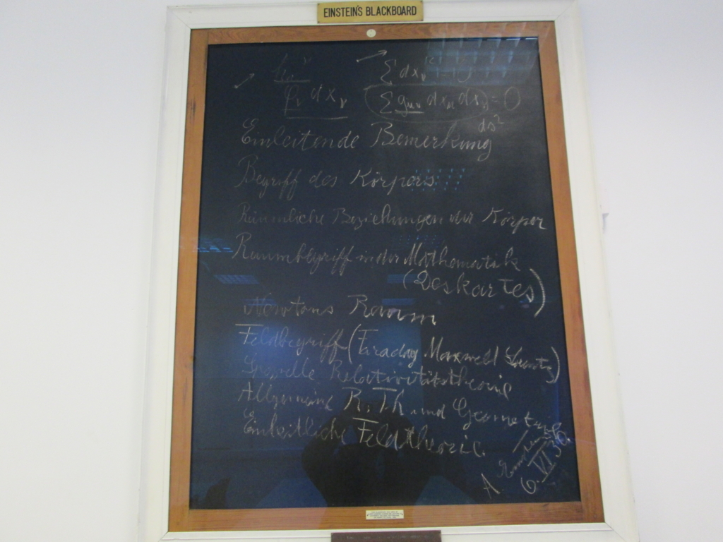 そのときにヨルマさんが見学させてくれたのが、1930年6月6日に英国のドイツ協会が開催した講演会でアルバート・アインシュタインがドイツ語で書いたこの板書。一般人向けだったらしく、数式も少ないものになっている。